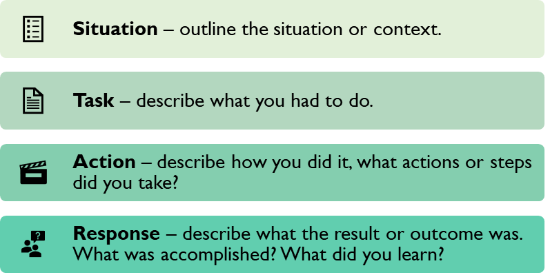 During behavioural interviews, you will be asked to give specific examples from past experiences in your work, life, school etc. The best way to answer each question is using the STAR formula: